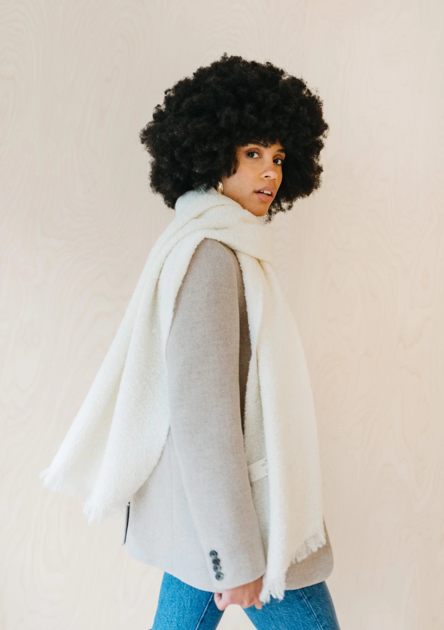 This super soft TBCo Oversized Scarf with fringe is woven from undyed fibres, meaning the gorgeous colour comes completely from the natural fleece of the alpaca. No dye means less water and and energy consumption, so it’s just as nice for the planet as it is for your wardrobe. Traceable Peruvian yarn, famous for its durability and warmth, is combined with 11% recycled nylon for a sumptuous bouclé texture.