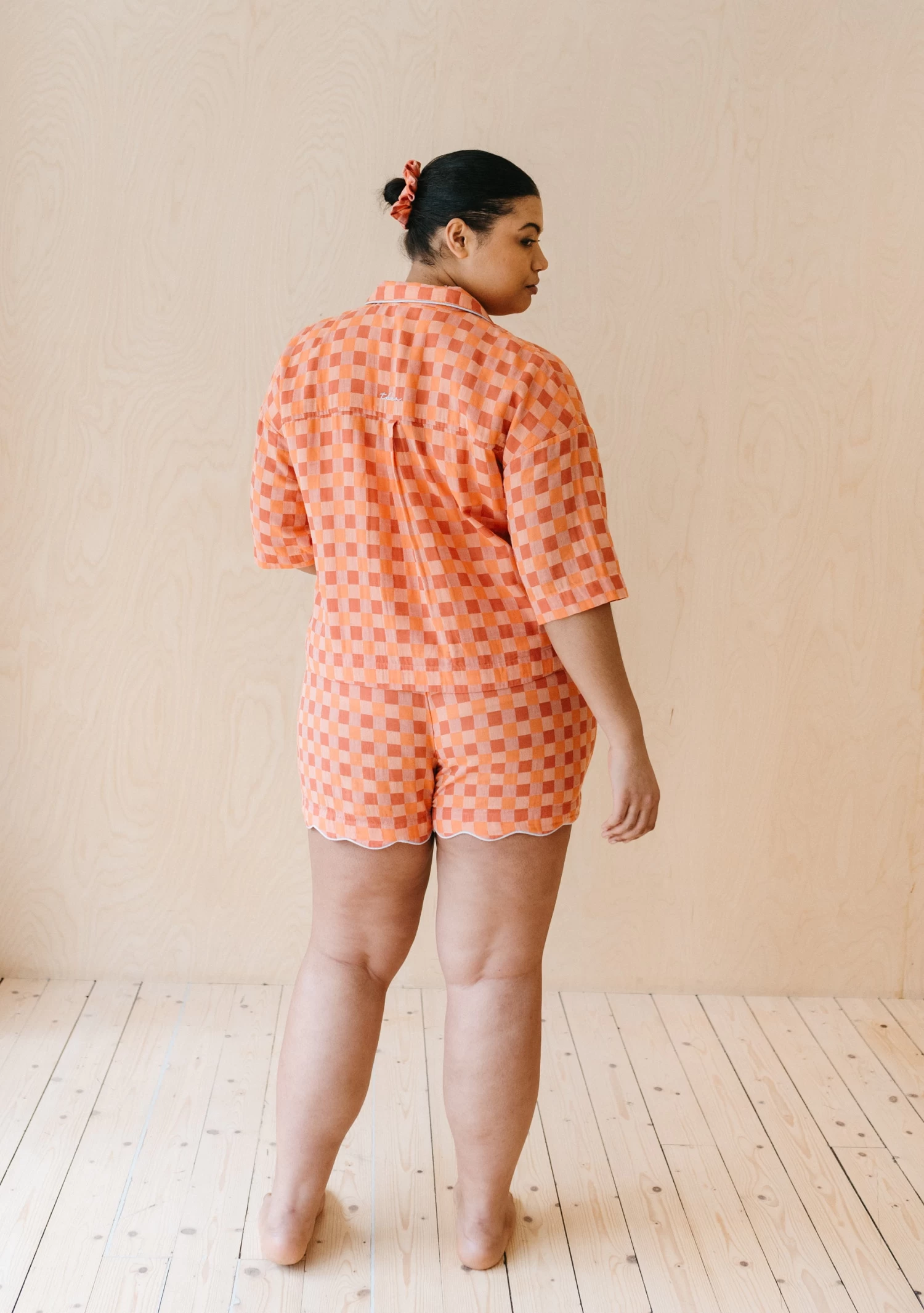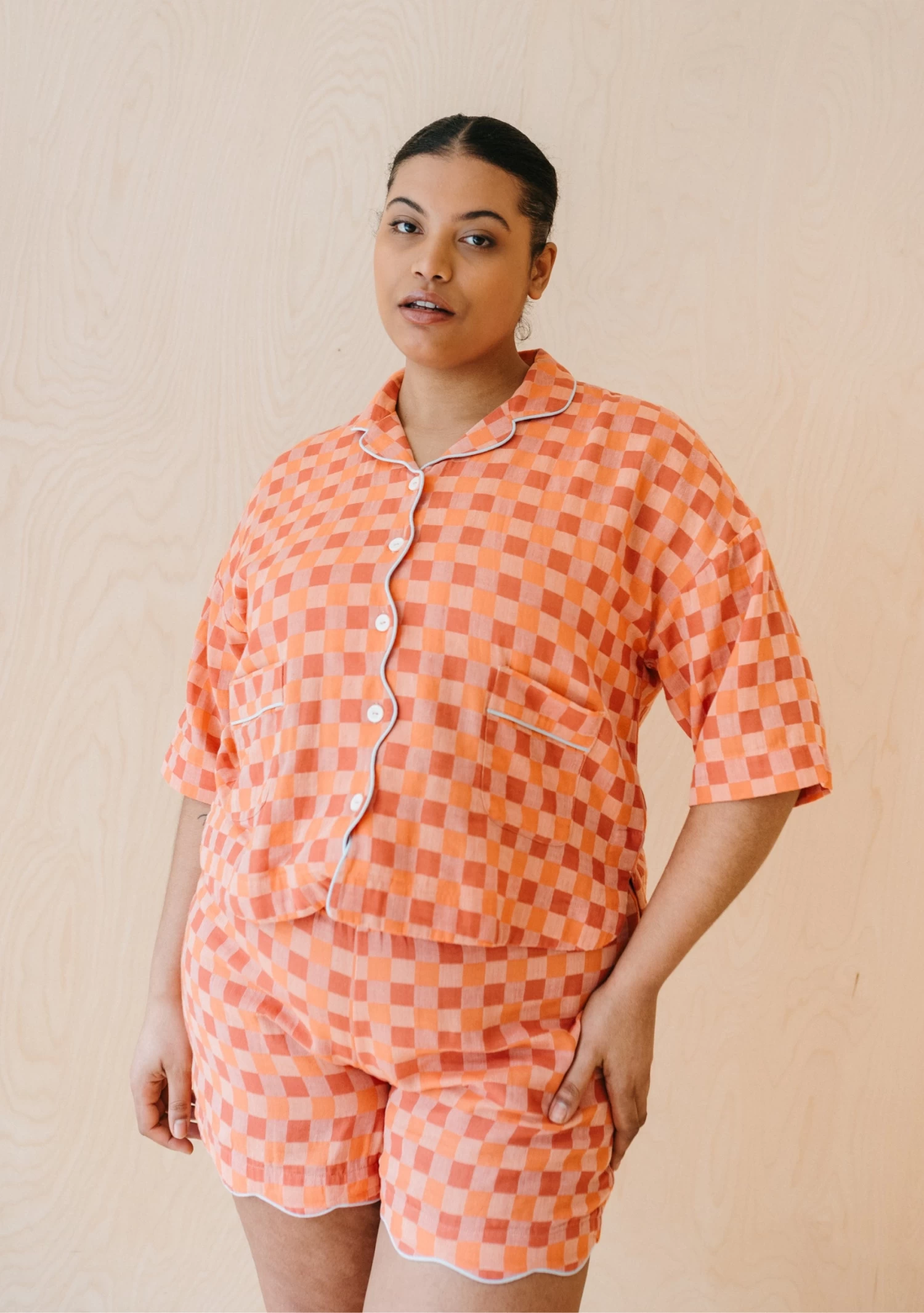 Finally, PJ’s that don’t make you hide behind the door when your takeaway arrives. We simply couldn’t find the perfect pair of PJ’s, so we designed them ourselves and we don’t blame you if you find yourself wearing them outside the house, too. Each detail of these apricot PJ’s have been thoughtfully designed, from the checkerboard pattern to the blue contrast piping along the scalloped edge. The crinkle cotton fabric hides creasing and is breathable while you sleep. The boxy fit and elastic waist is comfy. And best of all, pockets. Mix and match these PJ’s with our robes, eye masks, scrunchies and bedding to complete your look. Adorable travel bag included.