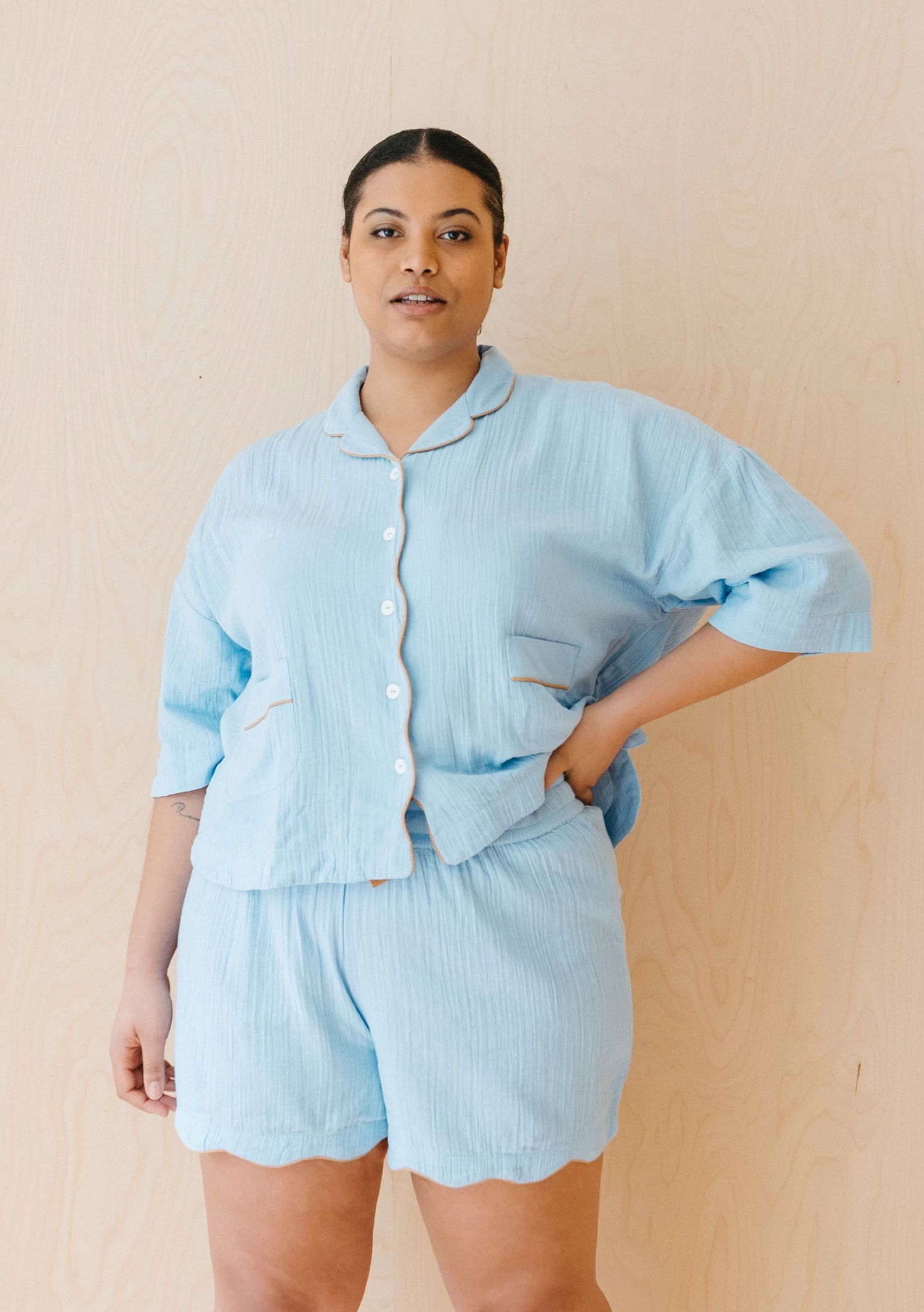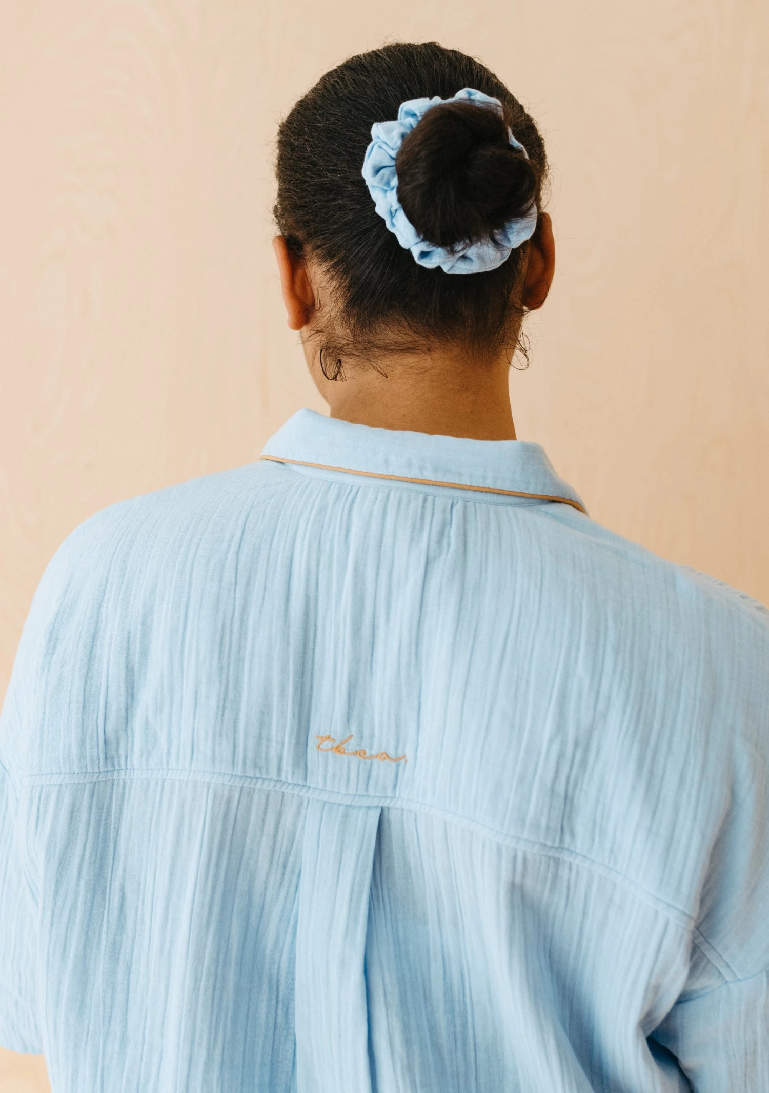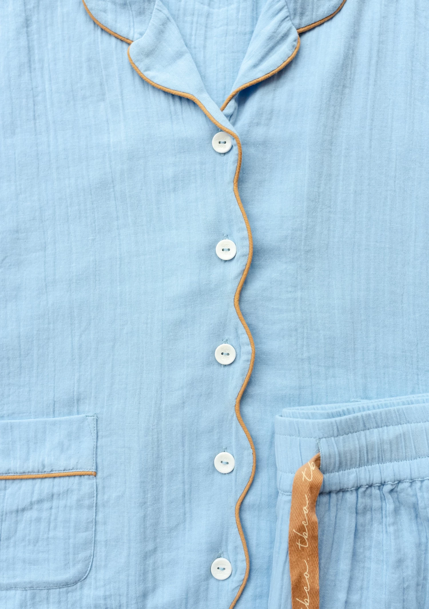 Finally, PJ’s that don’t make you hide behind the door when your takeaway arrives. We simply couldn’t find the perfect pair of PJ’s, so we designed them ourselves and we don’t blame you if you find yourself wearing them outside the house, too. Each detail of these blue PJ’s have been thoughtfully designed, from the camel contrast piping to the scalloped edge. The crinkle cotton fabric hides creasing and is breathable while you sleep. The boxy fit and elastic waist is comfy. And best of all, pockets. Mix and match these PJ’s with our robes, eye masks, scrunchies and bedding to complete your look. Adorable travel bag included.