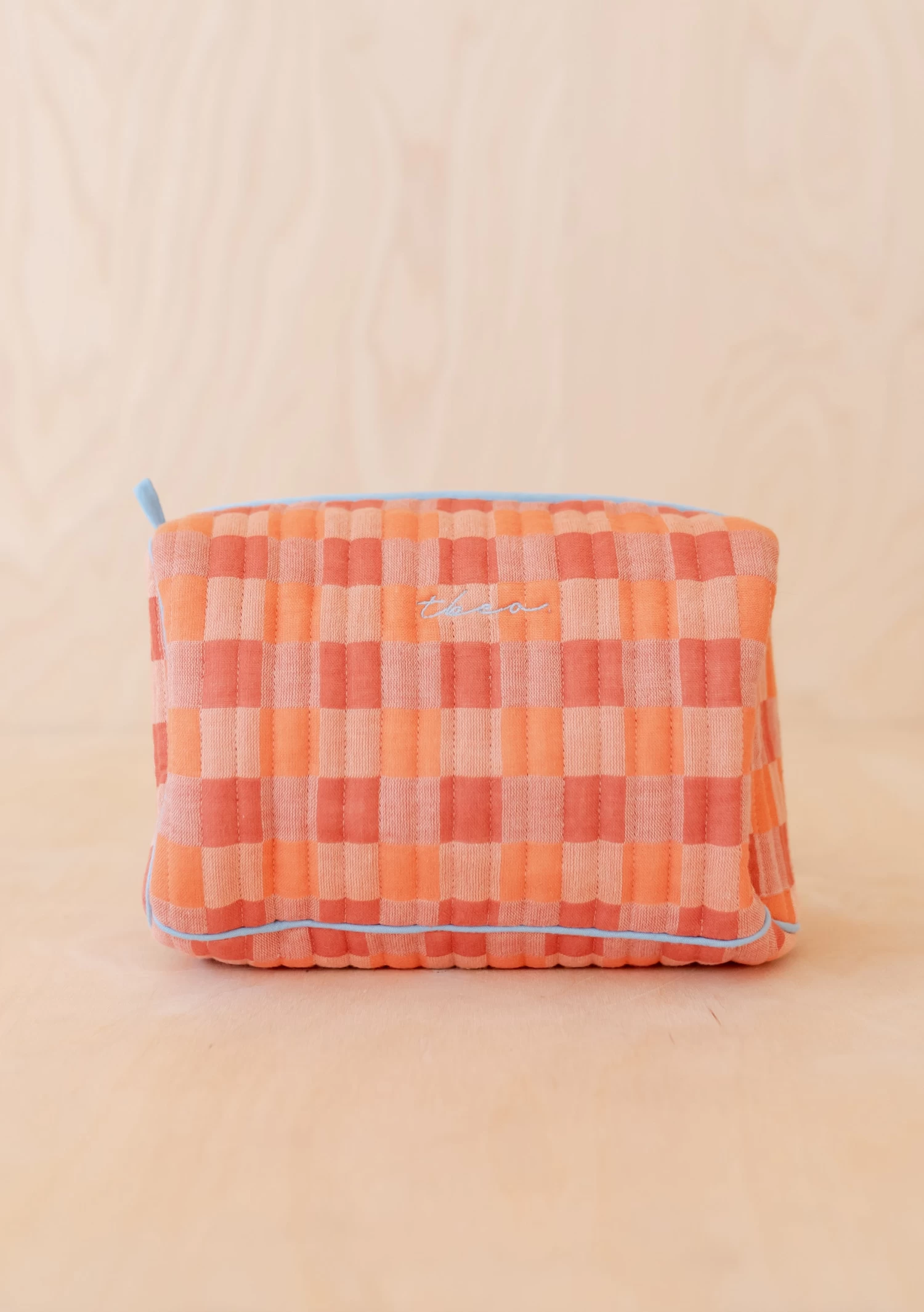 Take TBCo on the go with this quilted apricot wash bag featuring a checkerboard pattern, blue contrast piping and an embroidered TBCo logo. Its roomy interior means you can fit all your favourite items, while it’s inside pockets keep you organised. Best of all, it matches our apricot PJ’s for the ultimate put-together look.