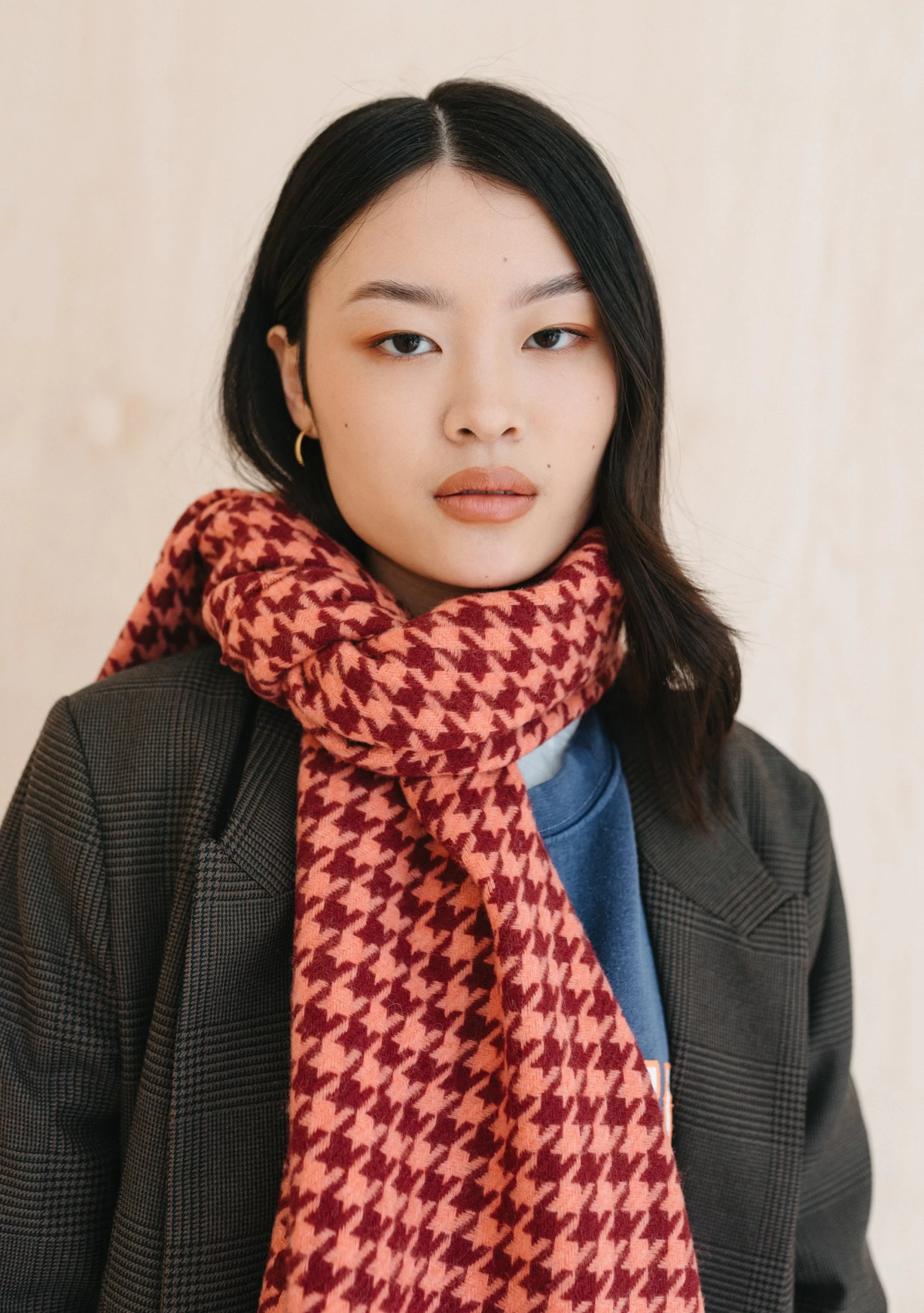 Featuring a mix of berry tones in a modern houndstooth design, this fringed lambswool scarf offers a cocoon of warmth. Tie it, wrap it or drape it for versatile styling. The unique crimps in the individual lambswool strands create air pockets that retain heat while repelling moisture, keeping you warm when you’re cool and cool when you’re warm for a more comfortable winter outfit. Along with being a naturally insulating, breathable and hypoallergenic textile, it’s beautifully soft. Doesn’t get much better than that.