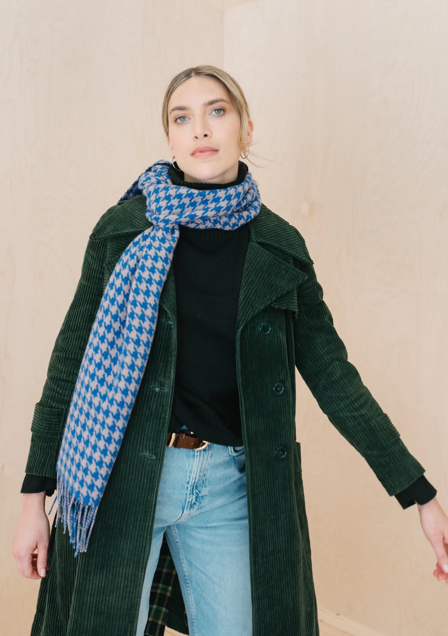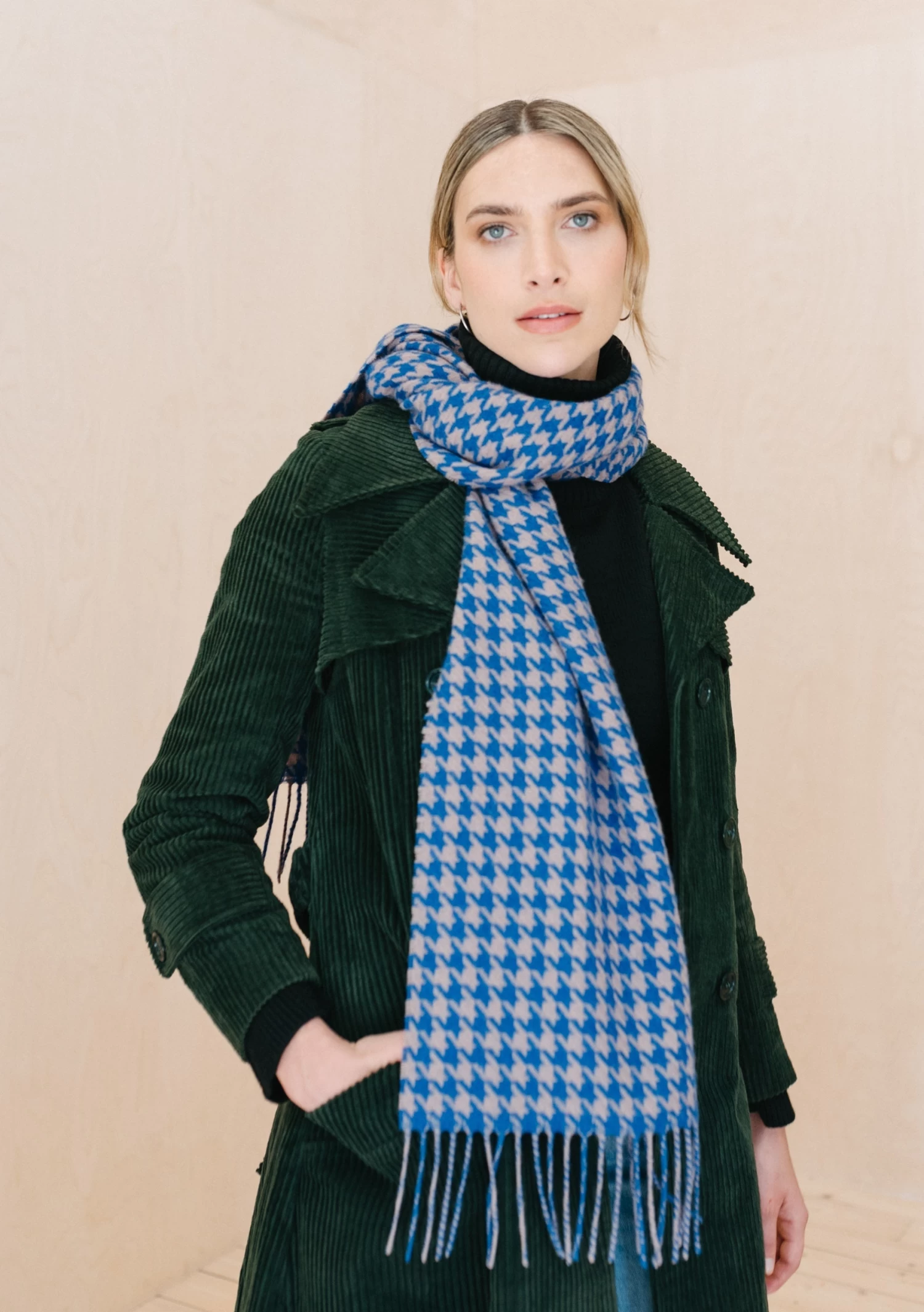 Featuring a mix of cool tones in a modern houndstooth design, this fringed lambswool scarf offers a cocoon of warmth. Tie it, wrap it or drape it for versatile styling. The unique crimps in the individual lambswool strands create air pockets that retain heat while repelling moisture, keeping you warm when you’re cool and cool when you’re warm for a more comfortable winter outfit. Along with being a naturally insulating, breathable and hypoallergenic textile, it’s beautifully soft. Doesn’t get much better than that.