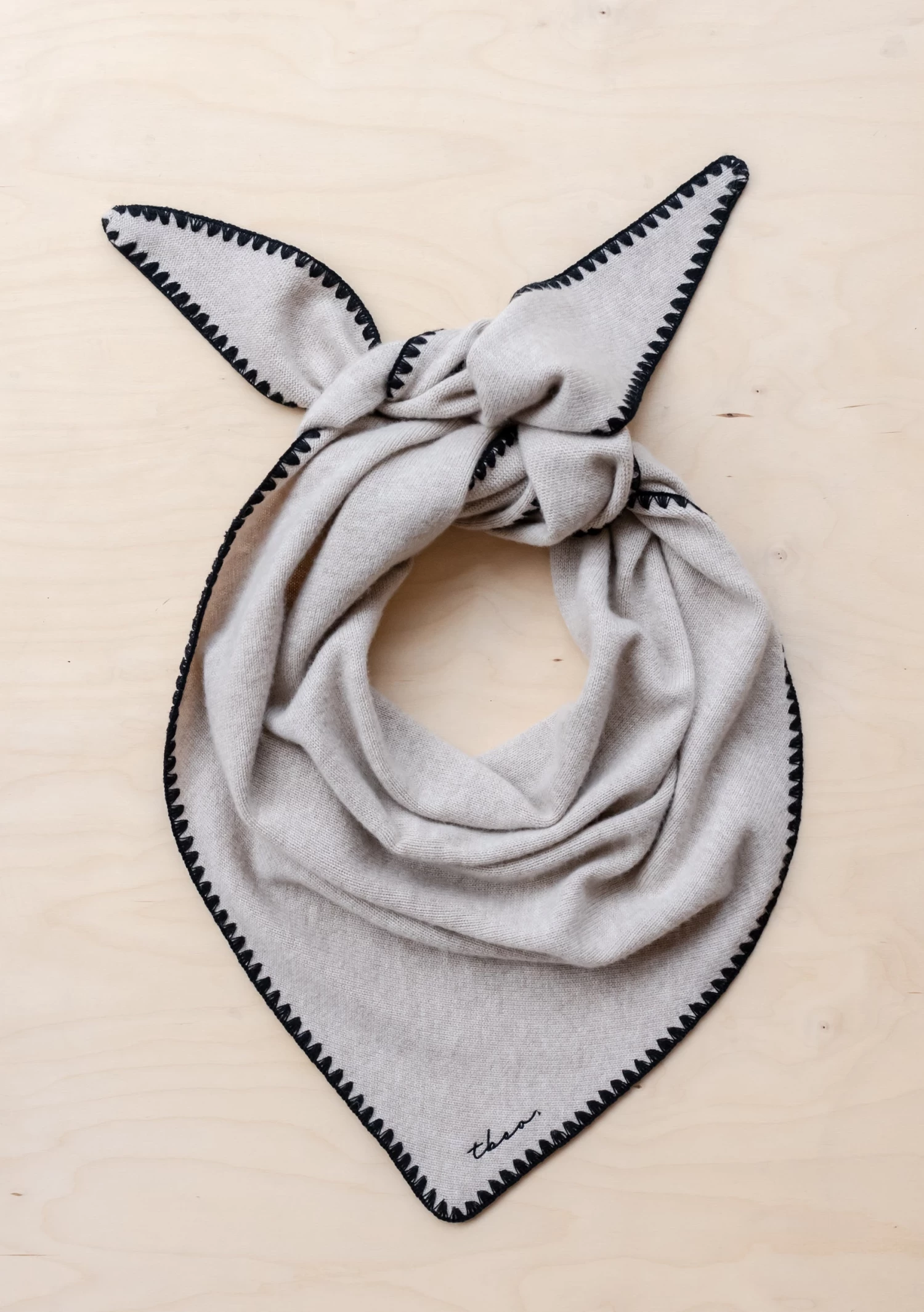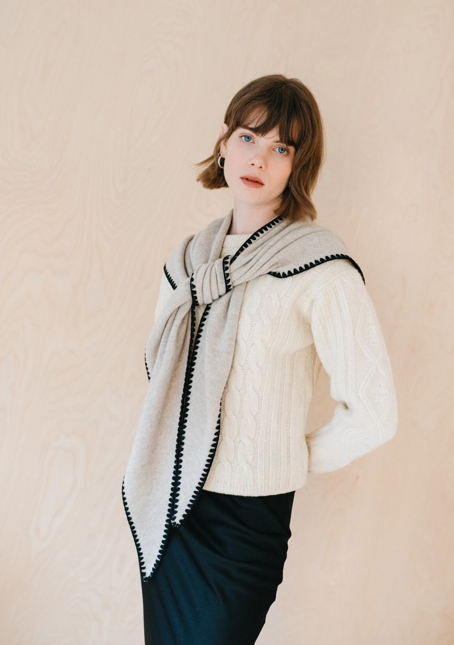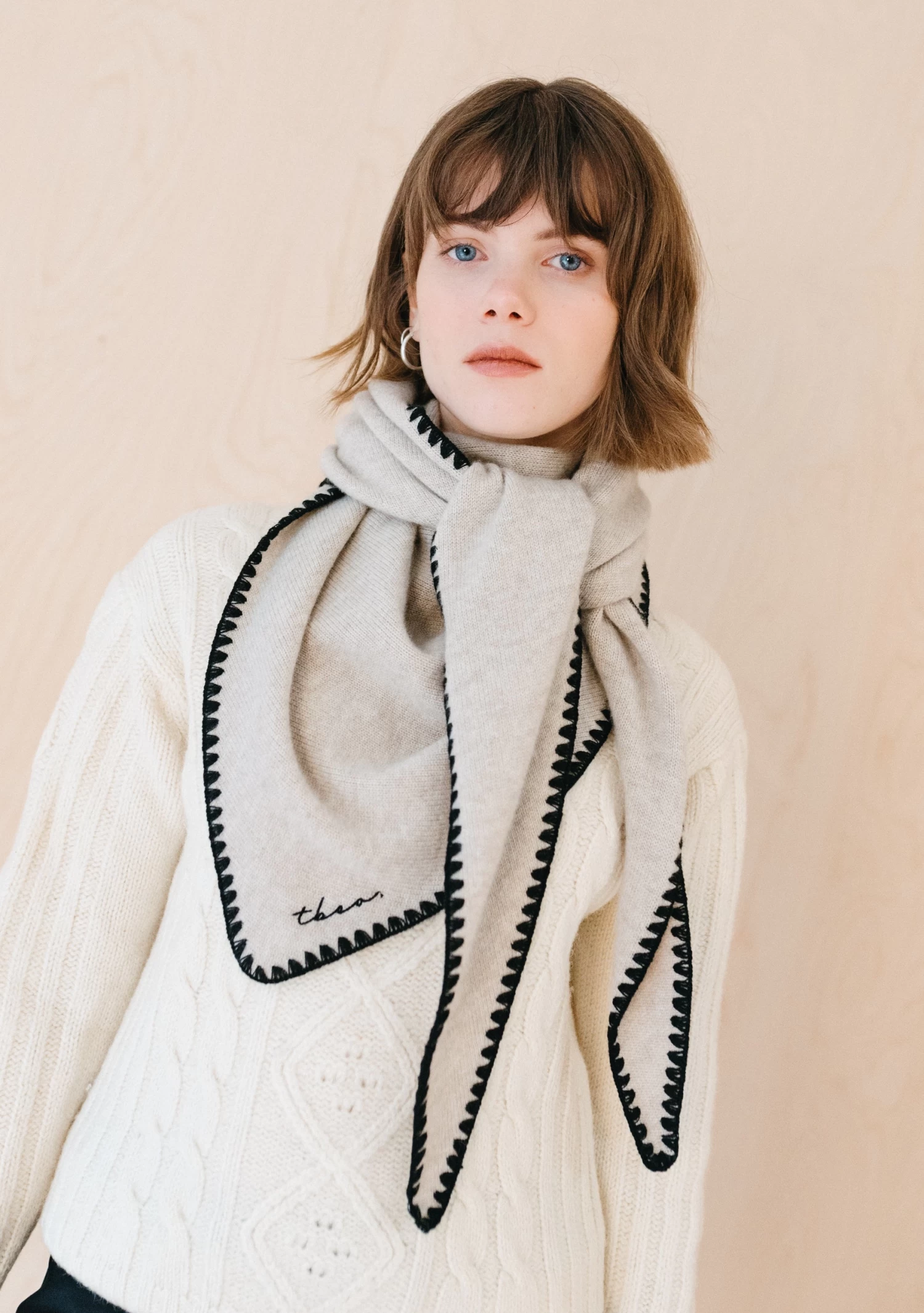 Elevate your outfit with this large triangle scarf knitted from super soft merino wool in a gorgeous oatmeal melange. Its black fan-stitched edge adds a pop of interest and it can be tied multiple ways for endless styling options. It’s the perfect neutral piece you’ll reach for time and time again.