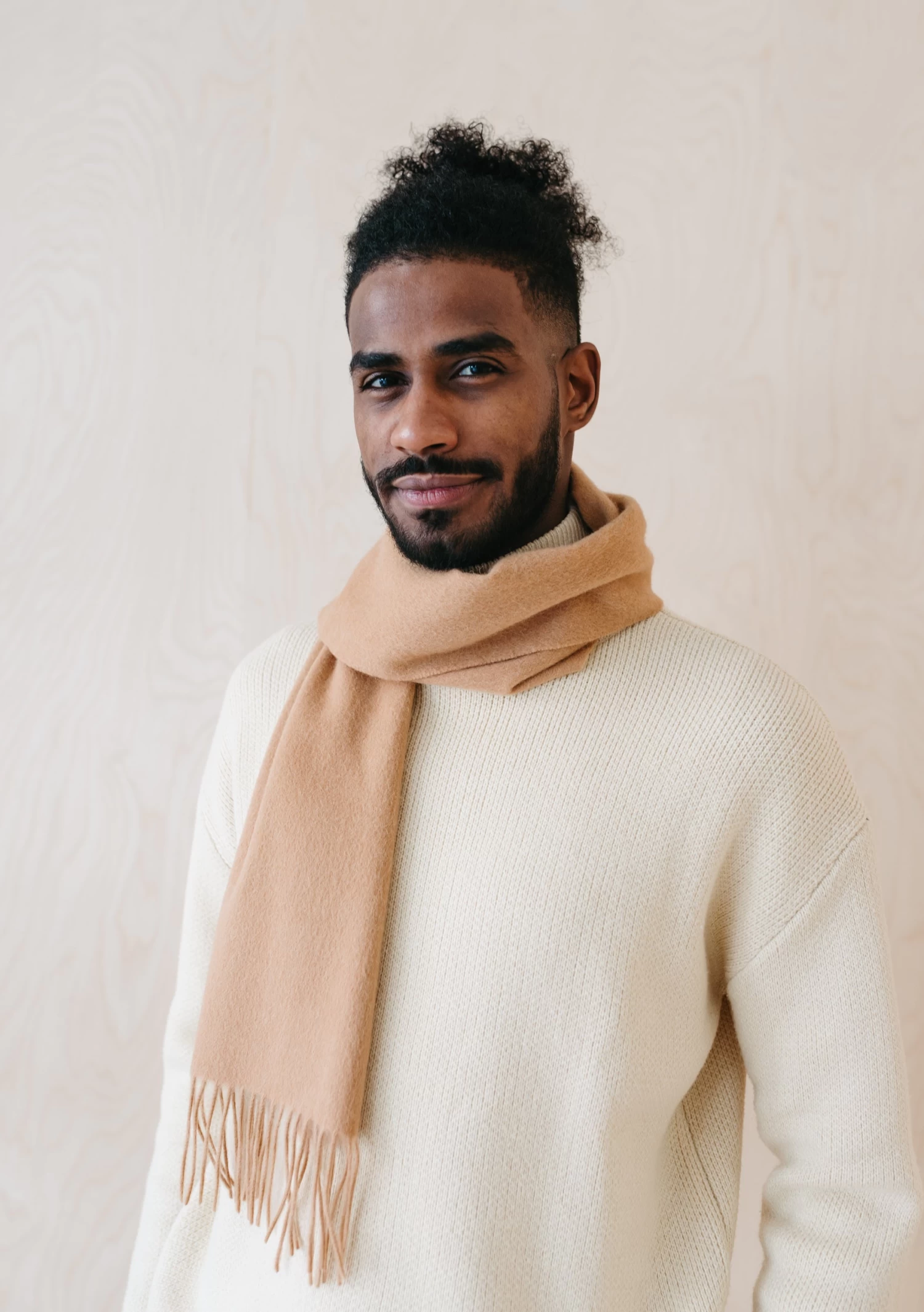 This TBCo Men’s Scarf with fringe is woven from soft cashmere.