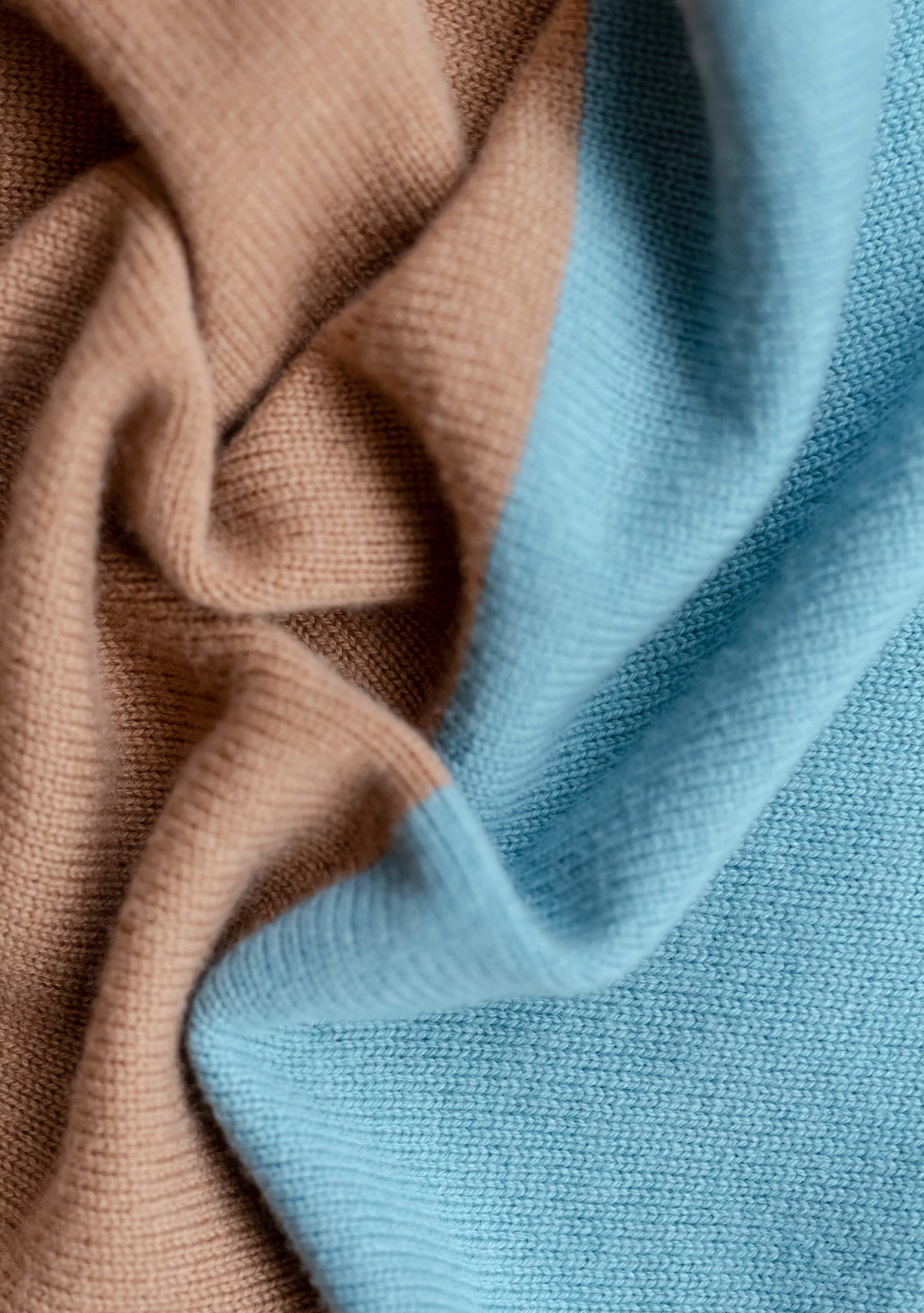 The perfect finishing touch. Add a pop of colour and interest to your outfit with this two-toned camel and blue TBCo triangle scarf, featuring a stitched edge, embroidered TBCo logo and knitted from merino wool. Tie it in multiple ways for endless styling options.