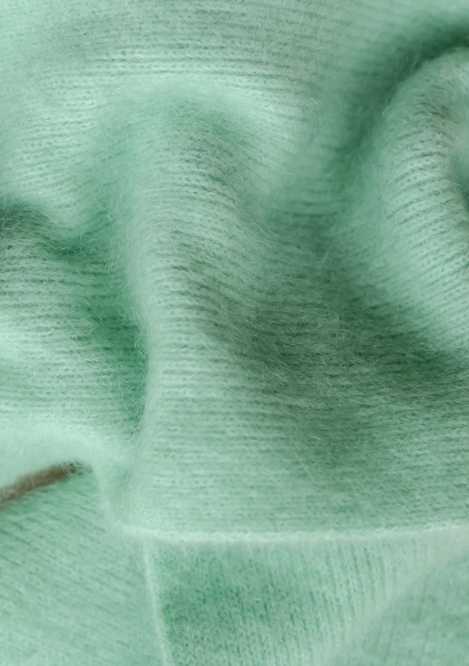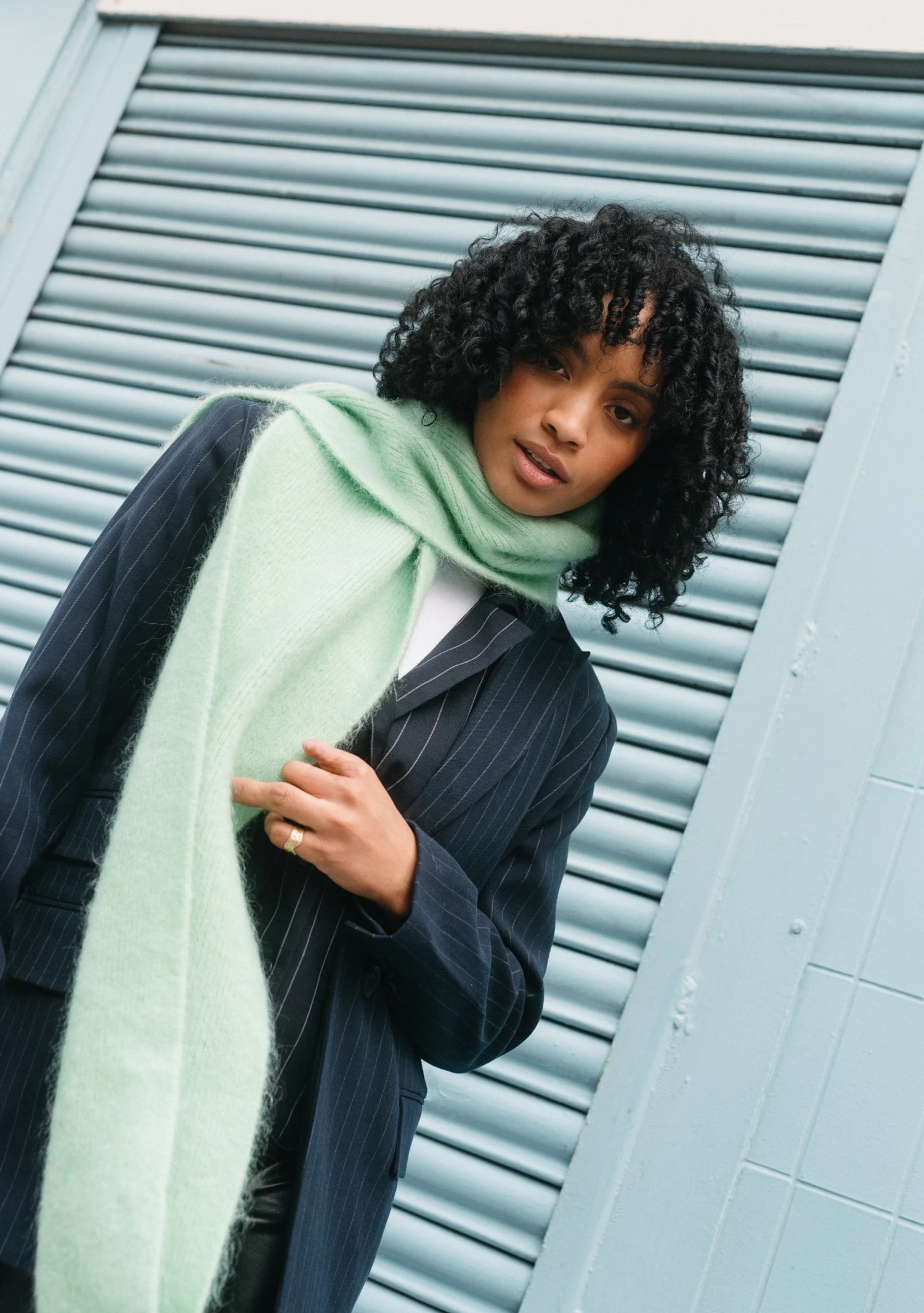 Thick, tonal and textural, just what your outfit needed. This mint mohair scarf is woven from the coat of the Angora goat and blended with recycled nylon for extra strength & durability.