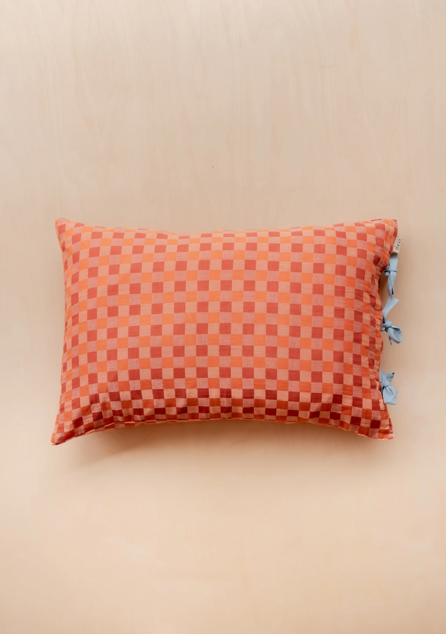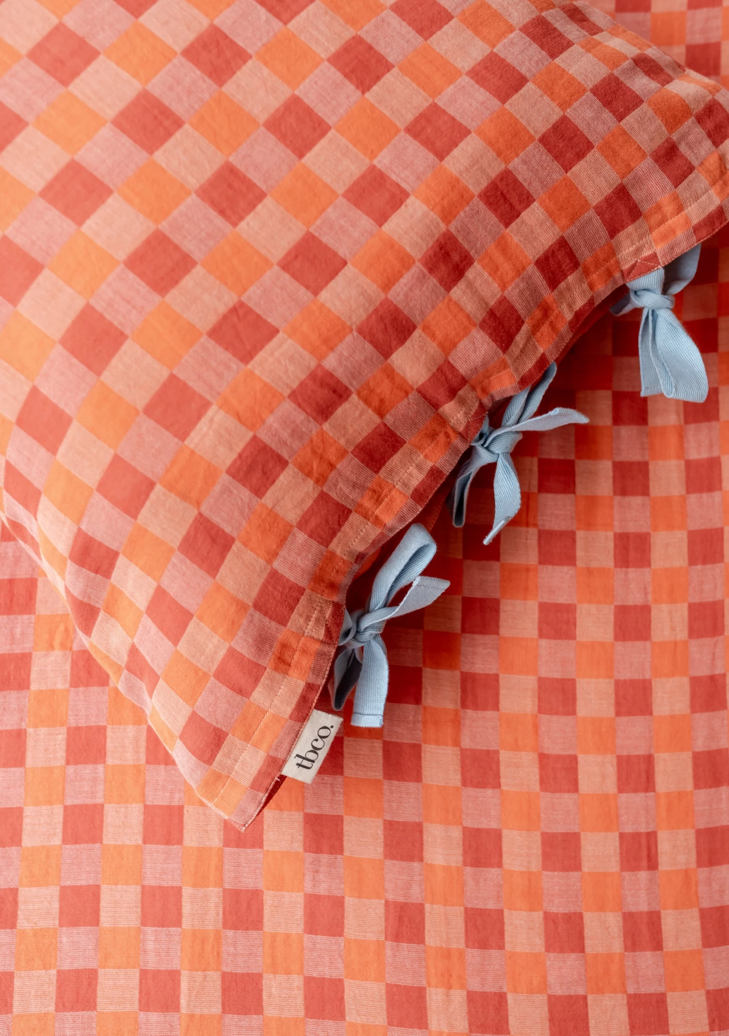 Revive your bedscape with a pair of apricot pillowcases featuring a checkerboard pattern and blue tie closures. The cotton is skin-friendly and breathable, ensuring a peaceful night’s sleep. Best paired with cosy evenings and slow mornings. Dust bag included for easy storage. Mix or match with our collection of duvet covers.